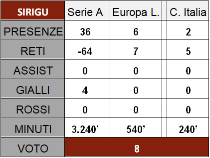 Limitandosi ad analizzare i numeri, quella di Sirigu potrebbe sembrare una stagione impietosa. In stagione, tra campionato, Coppa Italia ed Europa League, il portiere ha infatti collezionato 44 presenze arrivando a subire 76 gol. Tantissimi per un portiere del suo livello, ma le colpe non sono affatto imputabili a lui, anzi. Il numero trentanove è stato di gran lunga il miglior granata della stagione e con le sue parate ha consentito alla squadra di conquistare punti importantissimi per la salvezza. La fase difensiva ha mostrato lacune evidenti (non a caso i granata hanno la quinta peggior difesa del campionato), ma Sirigu ha saputo metterci una pezza e limitare i danni in più di un'occasione. Se il Toro è riuscito a conquistare la salvezza evitando di rendere disastroso un campionato già fallimentare, un'importantissima fetta del merito è sicuramente sua. Per lui anche una piccola soddisfazione personale: è stato il primo portiere in Serie A ad aver parato un rigore (a Gervinho contro il Parma) con le nuove regole sul posizionamento al momento della battuta. Un'ottima stagione, dunque, al contrario di quello che è stato il rendimento generale della squadra.