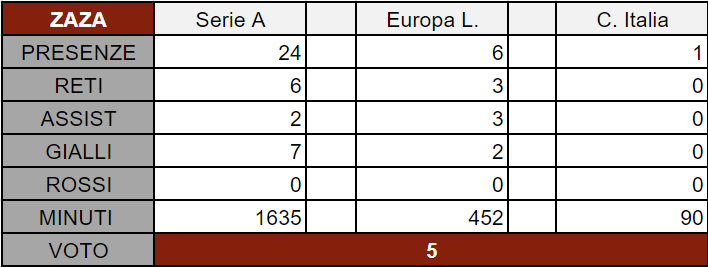 All'inizio e alla fine, uno Zaza estivo. Nel mezzo, una stagione ampiamente sotto tono nella quale non è mai riuscito a rendersi veramente utile e al centro del gioco. L'attaccante è partito forte nelle gare di qualificazione all'Europa League, con tre gol e tre assist. Nel post Covid, altre tre marcature (anche di buona fattura, come quella contro il Bologna) che lo hanno rimesso in carreggiata, soprattutto in vista della nuova gestione targata Giampaolo. Però queste due parti dell'annata non riabilitano l'intera stagione passata pressoché nell'anonimato, tra prestazioni nervose e poco concrete. Serve più costanza e più freddezza sotto porta, non solo nei mesi estivi...