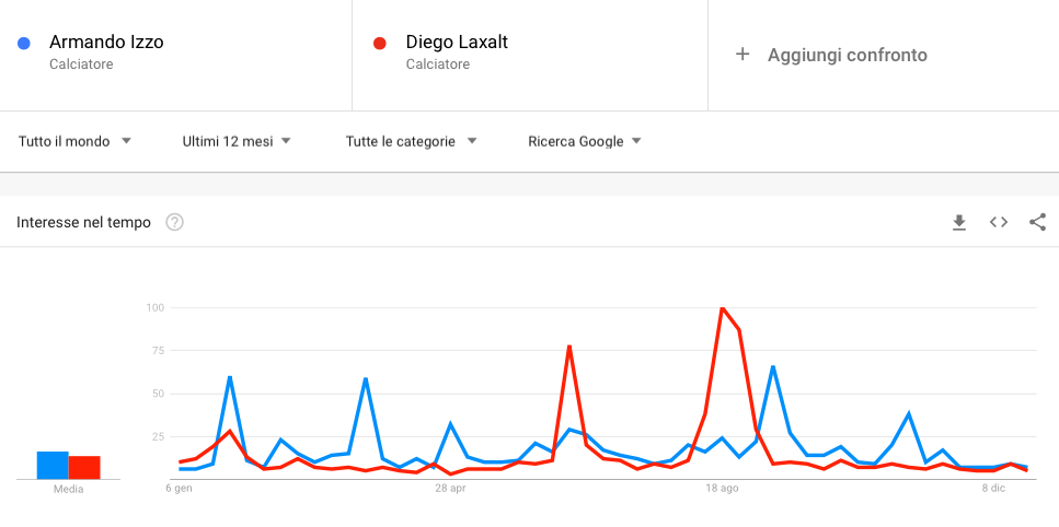 A completare la top 5 troviamo Armando Izzo e Diego Laxalt. Per il primo l'aumento è dovuto sicuramente anche alle convocazioni in Nazionale italiana. Netta la differenza tra i due se si prendono in considerazione solo le statistiche italiane, si assottiglia di molto se prendiamo in considerazione il mondo intero. Laxalt allarga il suo campo in Uruguay. E' nella sua terra natia che l'esterno fa il boom di clic.