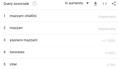Seconda parte dell'anno turbolenta per Walter Mazzarri. Lo si nota anche dai clic che vengono effettuati sull'allenatore, le ricerche sono in crescendo. Il picco il tecnico di San Vincenzo lo rileva nel periodo tra il 27 novembre e il 2 ottobre. Il motivo di questo punto di massimo si trova nel parole associate alle sue ricerche. Nel 2019 Mazzarri ha rilevato un aumento di ricerche associate con le parole "Chiellini" ed "esonero". Quei giorni sono stati tra i più complicati per l'allenatore granata: le sconfitte con Lazio (4-0) e derby della Mole hanno messo in bilico la sua panchina. Aver citato Chiellini come esempio da seguire per la sua squadra ha creato qualche screzio con una frangia di tifosi (leggi qui). Nel 2020 per Mazzarri la speranza è che aumentino i clic per i risultati conseguiti sul campo e non per dichiarazioni fuori dal terreno di gioco o riguardanti la sua panchina.