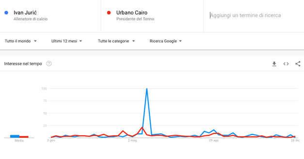 Uscendo dal campo e analizzato le ricerche su Urbano Cairo e Ivan Juric si nota che l'allenatore ha avuto la meglio rispetto al presidente. Questo dato trova motivazione per la punta di clic a fine maggio del croato, quando è approdato al Torino ed ha avuto la controversa intervista a Sky nel post partita di Napoli-Hellas Verona, nella sua ultima panchina con gli scaligeri. "Subito una grande ca****. Mi mancate di rispetto", ha risposto furioso l'allenatore dopo che l'inviato Massimo Ugolini ha iniziato la domanda: "Carica diversa del Verona questa sera".