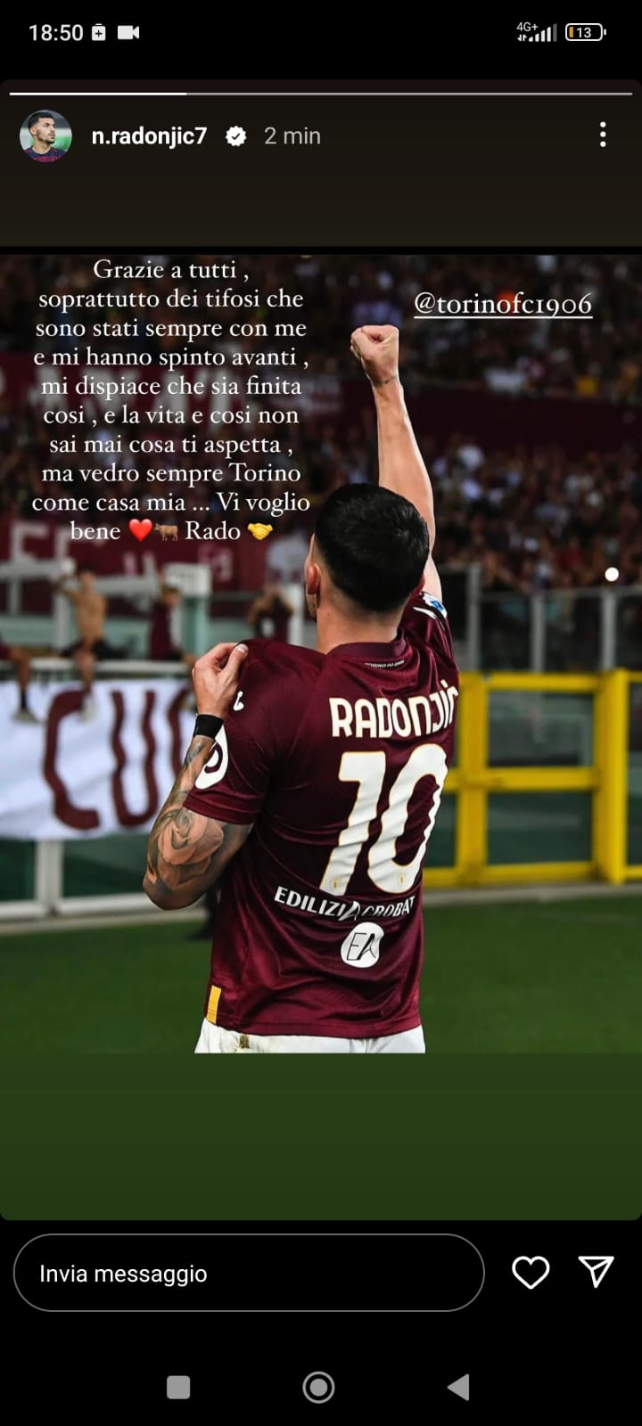 Nemanja Radonjic ha accettato la proposta del Maiorca, lasciato l'Italia e ora anche salutato i tifosi del Torino. Il trequartista serbo, che in estate aveva preso la maglia numero 10 granata, era finito con il passare delle settimane ai margini del progetto Juric tra esclusioni tecnico-tattiche dovute al cambio modulo e screzi extra campo. Così Radonjic ha scelto di ripartire dalla Liga, non prima di salutare i tifosi del Toro postando una story che lo ritrae mentre esulta indicando lo stemma granata. "Grazie a tutti - ha esordito il serbo - Soprattutto ai tifosi che sono stati sempre con me e mi hanno spinto sempre avanti. Mi dispiace che sia finita così. La vita è così e non sai mai cosa ti aspetta, ma vedrò sempre Torino come casa mia... Vi voglio bene, Rado".