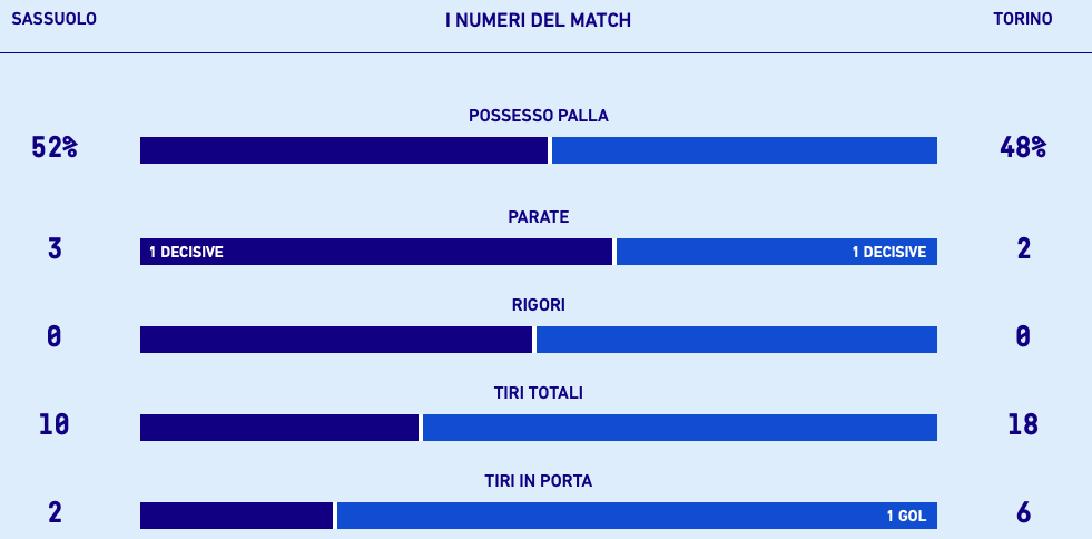 POSSESSO PALLA- I piemontesi hanno creato di più, avuto tante occasioni, hanno saputo concretizzare (anche se potevano fare più gol) e hanno vinto meritatamente. Interessante però notare che il possesso palla pende verso gli emiliani: 52% contro 48%. Ma la differenza l'ha fatto il modo in cui è stato esercitato. Il Sassuolo per il 63% l'ha fatto nella prima metà campo, mentre il Torino per il 50% nella metà campo avversaria. Inoltre il club granata ha avuto una maggiore velocità della sfera (32.48km/h vs 35.05km/h) e una maggior velocità di conduzione palla (11.75km/h vs 12.41km).