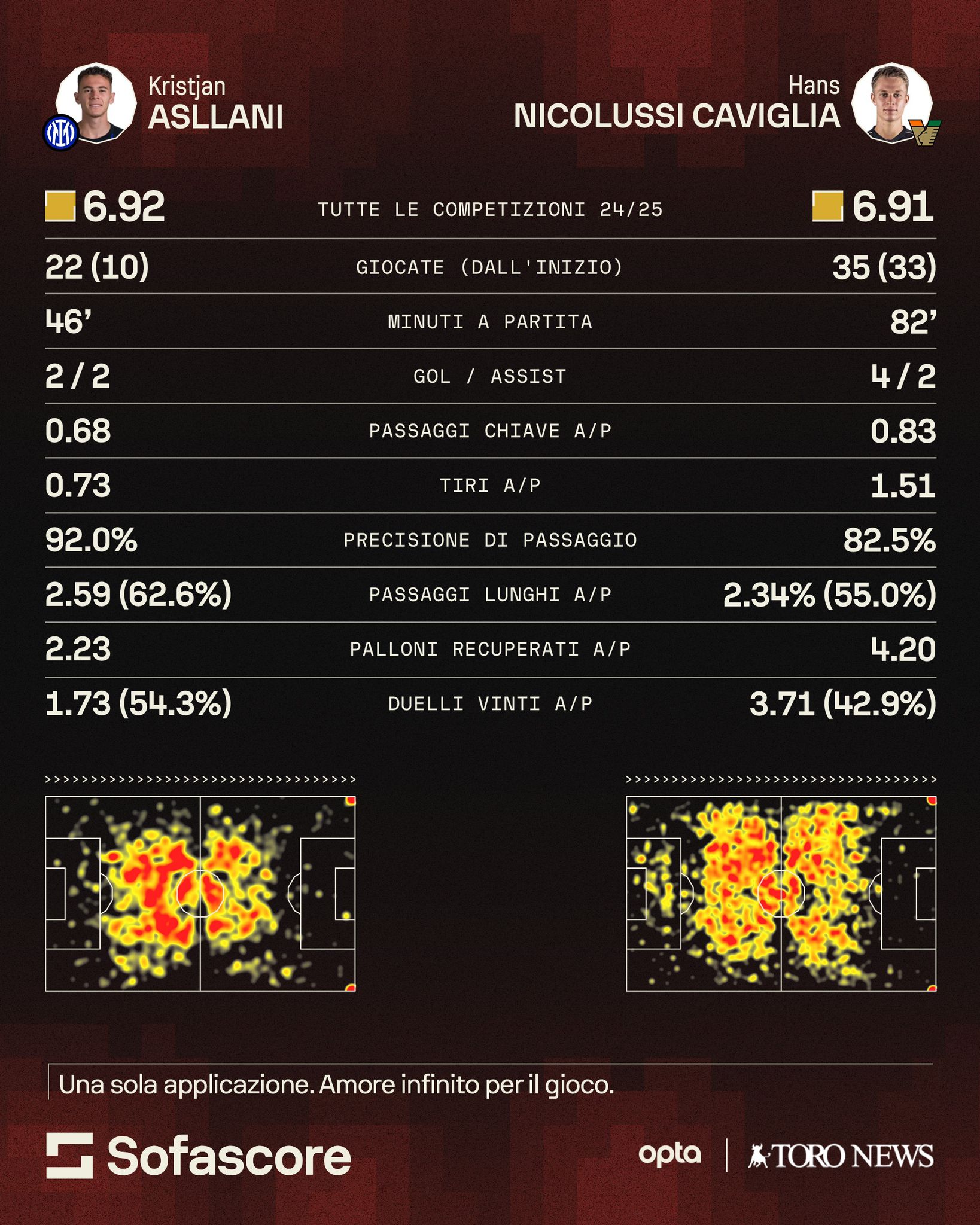 L'albanese dunque è destinato a diventare un giocatore del Torino. Cresciuto nel vivaio dell'Empoli, nella prima annata in Serie A, risalente alla 21/22, aveva subito lasciato buone impressioni. Sensazioni che hanno spinto l'Inter ad acquistarlo come rinforzo per la rosa di Simone Inzaghi. Con la maglia interista ha collezionato 99 presenze, quattro gol e vinto un campionato italiano, due Coppe Italia e altrettante Supercoppe italiane. L'esperienza di certo non manca, dato che con l'Inter ha disputato con continuità la Champions League. Un bagaglio esperienziale di un certo livello, se poi aggiungiamo anche che l'Albanese è titolare nella propria rappresentativa nazionale.Nicolussi Caviglia ha avuto un percorso più lungo prima di approdare in Serie A. Aveva esordito in Serie A, prestato al Perugia e poi Parma. Qui però si rompe il crociato e questo rallenta il suo percorso. Tornato nella seconda squadra bianconera, procede ancora a due prestiti: Sudtirol e Salernitana. Con i campani trova più continuità, prima di tornare ala Juventus e restare per una stagione. Siamo nell'annata 2023/24. Nicolussi ha 24 anni e per la prima volta si affaccia al panorama della prima squadra in maniera seria. Solo con la cessione a Venezia ha trovato davvero continuità, ma la prima annata da titolare è arrivata solo a 25 anni.