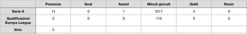PARTITA FLOP - Le prestazioni insufficienti del giocatore sono state molte: possiamo identificare però contro Cagliari, Inter e Verona le occasioni nelle quali è parso più in difficoltà. In queste gare il suo andamento è stato altalenante ed è stato superato facilmente dai suoi avversari, risultando non incisivo. Ma ciò che influisce di più nel giudizio finale sono state le frequenti disattenzioni, che hanno messo il Toro in una situazione di svantaggio, compromettendo l'andamento della gara ed il risultato finale.