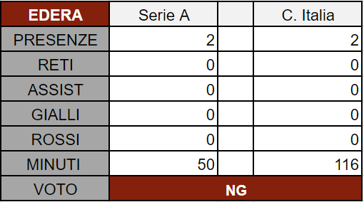 VOTO - Però oltre a non avere avuto molte opportunità, ha sempre avuto problemi legati alla costanza di rendimento, tanto da aver fatto riflettere la dirigenza del Torino. Infatti il nome di Simone Edera è tra quelli che vengono messi nei possibili partenti, perché non è esattamente al centro del progetto di Giampaolo. Il suo voto in questa prima parte della stagione non lo si può assegnare, ma ci si aspetta molto da questo ragazzo, anche se potrebbe arrivare lontano dal capoluogo piemontese. Il suo destino è legato alle decisioni societarie e soprattutto dell'allenatore granata.