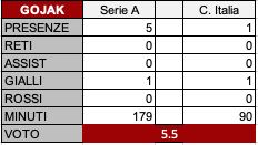 PARTITA TOP - Al momento non c'è stata una vera e propria partita top per Gojak, principalmente a causa dei pochi minuti disputati, ma probabilmente le cose migliori fin qui le ha fatte vedere nella sfida contro il Crotone quando subentrò a gara in corso per giocare i minuti finali. In quell'occasione Giampaolo lo mise dentro nella speranza che con una giocata potesse aiutare la squadra a trovare la rete decisiva. In effetti Gojak ci andò molto vicino prendendo un palo con un tiro-cross che per questione di centimetri non regalò tre punti, che sarebbero stati fondamentali, al Toro.