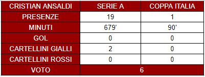 Nelle prime partite di campionato, seppur senza continuità, Cristian Ansaldi ha trovato un po' di spazio, poi l'infortunio al bicipite femorale l'ha tenuto fuori dal campo per sei giornate consecutive, facendogli trovare sempre meno spazio al suo rientro. L'esterno di Rosario ha collezionato solo 20 presenze in questa stagione, tra Serie A e Coppa Italia, per un totale di 769 minuti giocati e tre assist. L'argentino dopo una stagione in ombra e poco soddisfacente a livello personale, ringrazia i tifosi granata per questi 5 anni di amore e supporto (LEGGI QUI), con il contratto in scadenza a giugno.