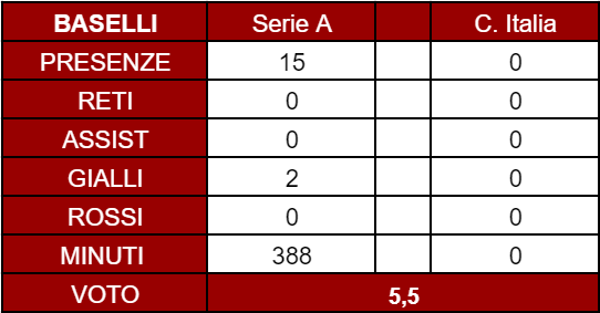 PARTITA TOP - La sua partita migliore, senza dubbio, è stata lo scontro diretto tra Torino e Parma nel girone di ritorno, con i granata che hanno conquistato tre punti d'oro per la salvezza anche grazie alla prestazione molto solida di Baselli in mezzo al campo, che dopo un calvario durato quasi un anno è tornato in campo per 90 minuti, dando prova di essere ancora un centrocampista di qualità, che serve assolutamente al Toro.