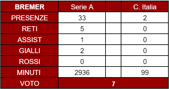 VOTO - Ma a parte lo scivolone contro i rossoneri, la stagione di Bremer è da considerare molto più che sufficiente. Infatti il giudizio è per un 7 pieno, visti i suoi grandi miglioramenti sotto ogni punto di vista ed essendo ancora così giovane (24 anni).