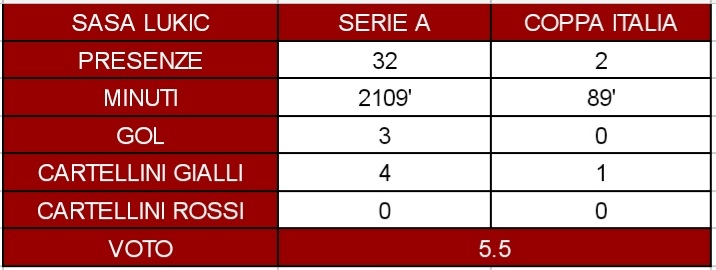 VOTO - In definitiva, il voto assegnato a Lukic è 5.5. Anche se nelle primissime partite di campionato il Torino è riuscito a fare punti solo quando il centrocampista serbo è stato in campo per l'intera durata del match, non basta per potergli assegnare una sufficienza piena. Sui giudizi pesano forse le aspettative che si erano create dopo quello sfolgorante inizio di stagione, ma Sasa rientra tra i tanti giocatori del Torino che quest'anno avrebbero potuto fare di più, nonostante l'impegno e la professionalità non siano mai mancate.