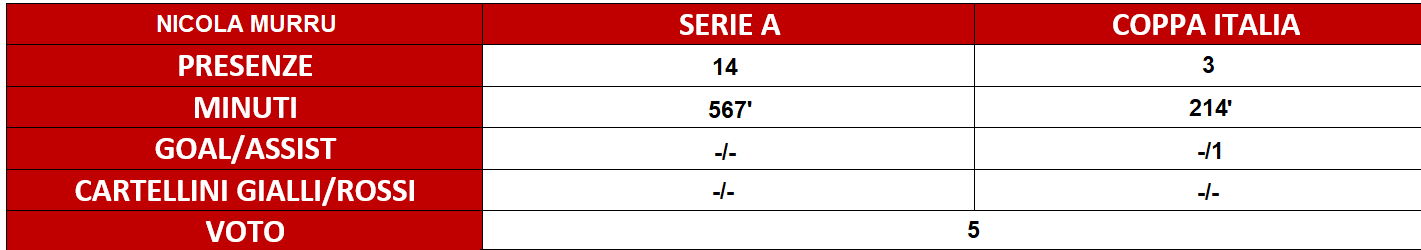 VOTO - Dunque, tenuto conto di tutto ciò e memori delle aspettative riposte nel classe 1994, il voto non può che essere insufficiente: un 5 motivato anche dalle poche occasioni avute di mettersi in mostra. Ma, anche quando ha giocato, raramente Murru ha convinto.