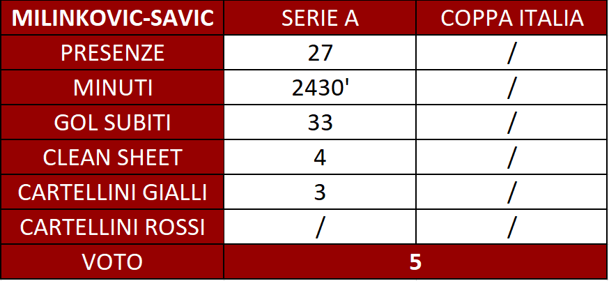 Vanja Milinkovic-Savic è partito da titolare, ma poi ha deluso e ha perso il posto. La sua pagella finale non può che essere insufficiente. Il portiere serbo è stato protagonista di discrete prestazioni quando il Torino giocava bene e vinceva nella prima parte di stagione, anche grazie a una squadra che concede ben pochi tiri agli avversari. Ma nel girone di ritorno, subito dopo lo stop per Covid di inizio gennaio che può essere un'attenuante ma fino a un certo punto, è caduto in una serie di errori che hanno indotto Juric a concedere il posto a Berisha.