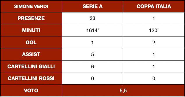Si riscatta parzialmente nel finale di stagione, prima di calare di nuovo a cavallo di Milan e Spezia. Illude da mezz'ala, ma il bilancio complessivo di Verdi è insufficiente