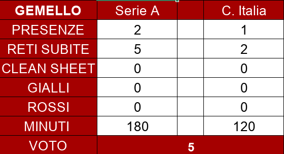 Le occasioni sono state poche, ma le poche avute non sono state sfruttate. Anzi, sono andate nel verso opposto. La stagione di Gemello non si può definire negativa. Non ha mostrato affidabilità tra i pali ed è risultato protagonista in negativo in due match su tre disputati. Quello del dodicesimo uomo non è un ruolo semplice da ricoprire, ma i suoi errori hanno pesato enormemente sull'economia della stagione granata. Soprattutto nelle gare con Bologna e Atalanta.