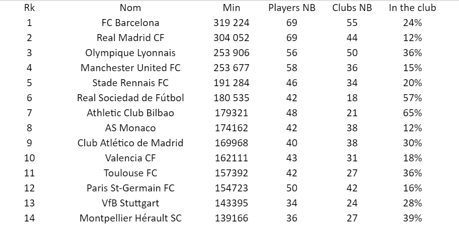EUROPA - Per quanto riguarda il discorso europeo, a guidare questa classifica sono le due squadre spagnole più forti, ovvero il Barcellona (in prima posizione) e il Real Madrid. Le due grandi di Spagna sono anche i migliori vivai d'Europa: entrambe hanno fornito 69 giocatori alle squadre dei top-5 campionati europei. Al terzo posto a sorpresa il Lione, con 56 giocatori. La prima squadra italiana in questa speciale classifica è la Roma: la società capitolina occupa la diciottesima posizione, secondo la ricerca del CIES è dunque il club italiano che negli ultimi cinque anni ha sfornato più calciatori di alto livello. La seconda squadra italiana è subito alle spalle della Roma, è l'Atalanta. Per trovare il Torino bisogna scendere di molto in classifica: i granata sono in 81ª posizione, non lontani - in realtà - dalla Juventus 67ª.