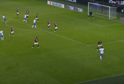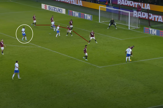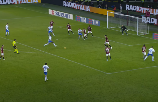 Il gol del vantaggio nerazzurro nasce da una lettura difensiva sbagliata dai granata, che si posizionano male e si schiacciano troppo verso la porta. Dumfries punta nell'uno contro uno Rodriguez.