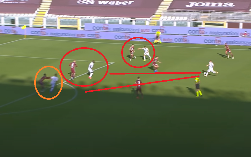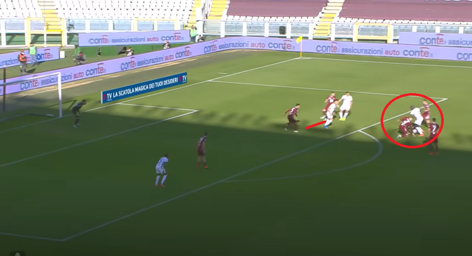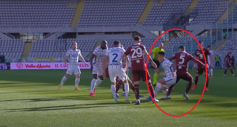 Il rimpallo porta Lyanco a lottare al limite dell'area con Lukaku. La situazione è ancora ideale per il Torino e di pericoli non sembrano essercene. Lukaku non ha spazio per calciare, i due esterni sono sotto controllo, ma il rimpallo dice male al brasiliano, bene al belga. Izzo risulta un po' distante da Martinez e questo inciderà moltissimo sull'esito dell'azione.
