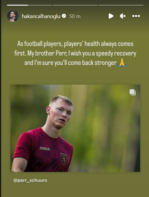 Hakan Çalhanoglu esprime vicinanza a Perr Schuurs. Il centrocampista dell'Inter, in rete dal dischetto per il 3-0 finale, ha dedicato al centrale olandese, uscito in barella in seguito a un brutto infortunio al ginocchio, una storia Instagram. "La salute dei giocatori viene sempre prima di tutto. Perr, fratello mio, ti auguro un pronto recupero. Sono certo che ti rialzerai più forte di prima"