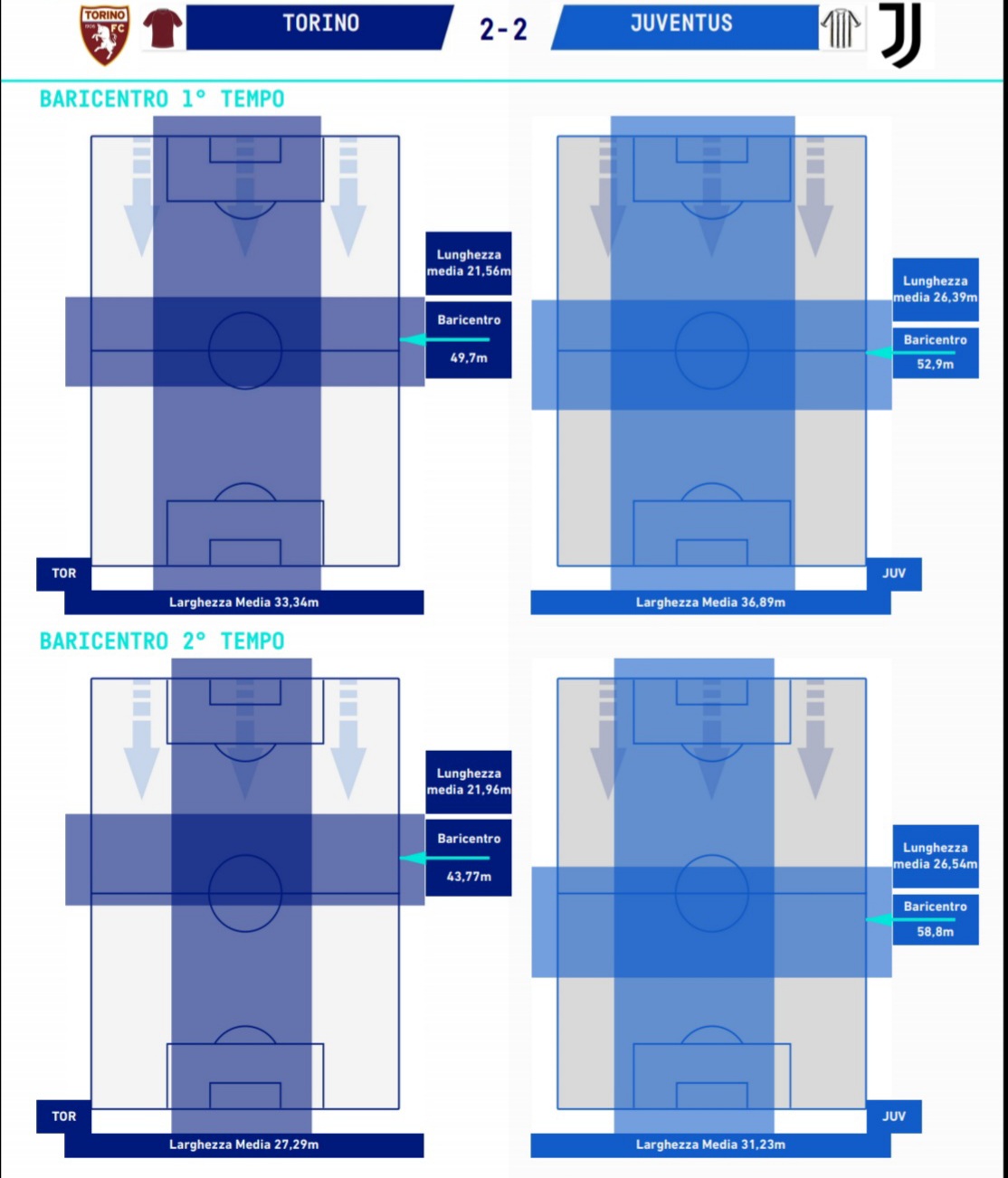 STRATEGIA – L'unico dato che all'apparenza sembra essere a favore dei bianconeri di Andrea Pirlo è quello che riguarda il baricentro medio delle due squadre. Perché all'apparenza? Per il semplice motivo che dallo schema si può notare che la Juventus ha sempre tenuto un baricentro più elevato rispetto al Torino, soprattutto nel secondo tempo. Ma questo non vuol dire che la formazione allenata da Pirlo sia stata più pericolosa di quella granata. Semplicemente il Torino è arrivato sottoporta in altri modi, sfruttando le ripartenze e i diversi errori di impostazione commessi dai bianconeri. Nella prima frazione di gioco i granata si sono mantenuti sui 49,7 metri, poco al di sotto della metà campo. Mentre la squadra di Andrea Pirlo si è stabilita sui 52,9 metri. Nel secondo tempo di gioco le differenze aumentano: il baricentro del Torino si abbassa fino ad arrivare ai 43,77 metri. Al contrario, quello della Juventus si alza stabilendosi sui 58,8 metri. L’aumentare del baricentro dei bianconeri nella seconda frazione di gioco, è dovuto soprattutto al fatto che la squadra di Pirlo, essendo passata subito in svantaggio, ha dovuto alzarsi maggiormente per trovare almeno il gol del pareggio. Lo ha trovato e alla fine il risultato può dirsi giusto per quanto prodotto in campo dalle due squadre.