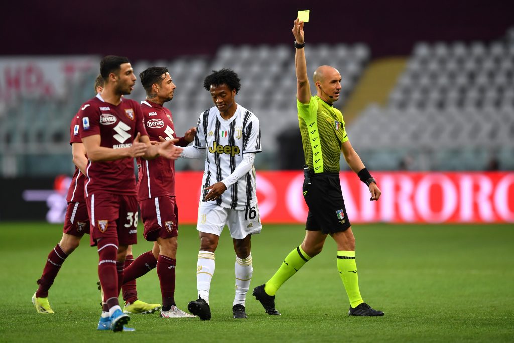 TURIN, ITALY - APRIL 03: Juan Cuadrado of Juventus competes for the ball against Cristian Daniel Ansaldi of Torino FC during the Serie A match between Torino FC and Juventus at Stadio Olimpico di Torino on April 03, 2021 in Turin, Italy. Sporting stadiums around Italy remain under strict restrictions due to the Coronavirus Pandemic as Government social distancing laws prohibit fans inside venues resulting in games being played behind closed doors. (Photo by Daniele Badolato - Juventus FC/Juventus FC via Getty Images)