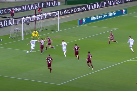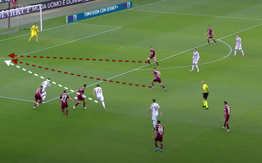 Morata di prima appoggia per Chiesa che scatta per vie centrali. Basta questo semplice movimento per mettere in crisi la fase difensiva granata. Izzo e Vojvoda non seguono più i marcatori, ma guardano solamente la palla. Izzo giustamente si stacca da Bentancour, ma Vojvoda non segue Chiesa e Mandragora ci mette troppo tempo a ripiegare verso l'area di rigore per chiudere la voragine apertasi dopo la sponda di Morata.