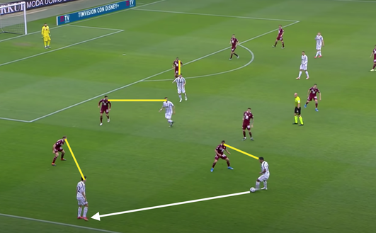 Chiesa riceve e con uno scavetto appoggia per Morata. Continuano a esserci gli 1 contro 1 di prima (eccetto Rincon che si avvicina in zona palla e si allontana da Alex Sandro).