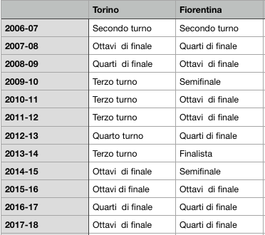 Negli ultimi 13 anni mai oltre ai quarti i granata. Meglio i Viola, anche se per loro la vittoria manca dal 2001