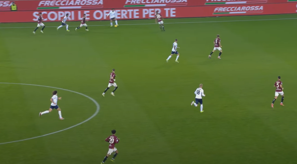 Lo spagnolo riceve dal brasiliano e si accentra. Il Toro sta coprendo comunque bene, perché Lovato è su Immobile, Masina su Isaksen e Ilic su Guendouzi, le coppie sono giuste.