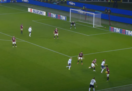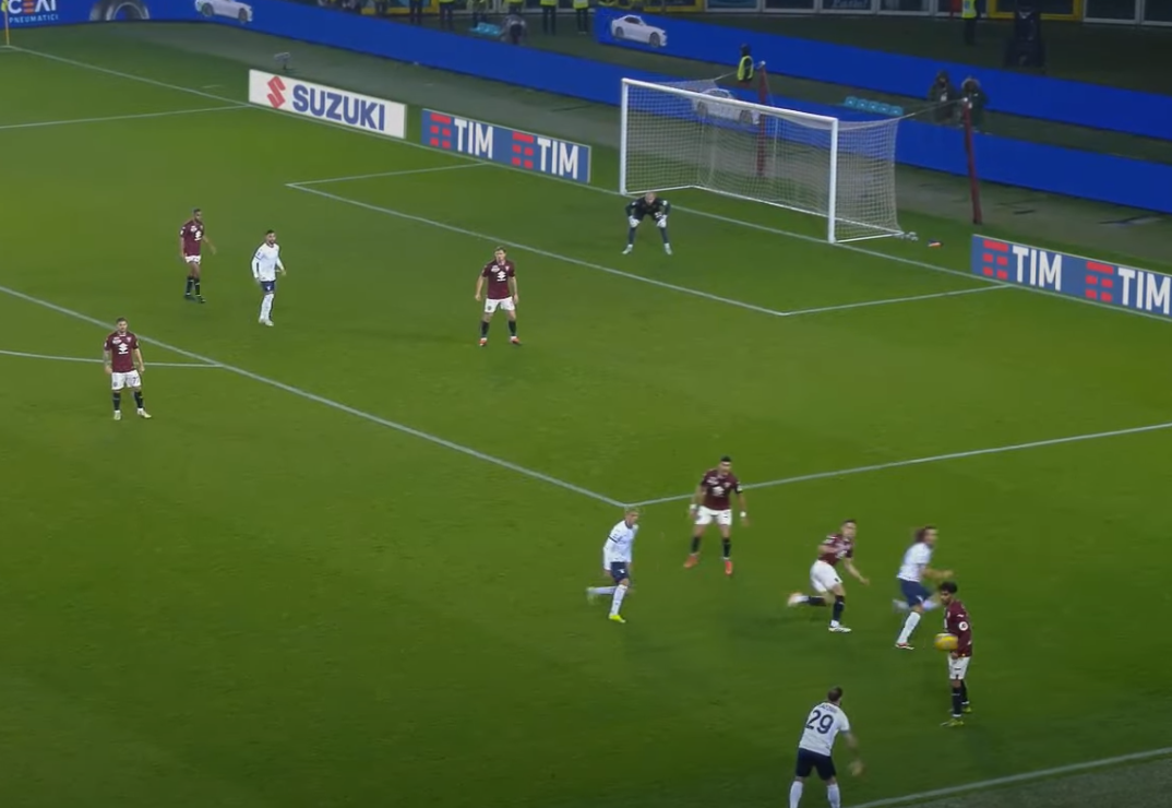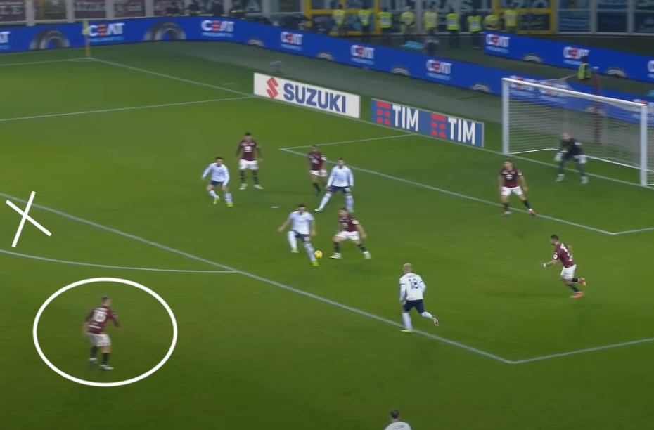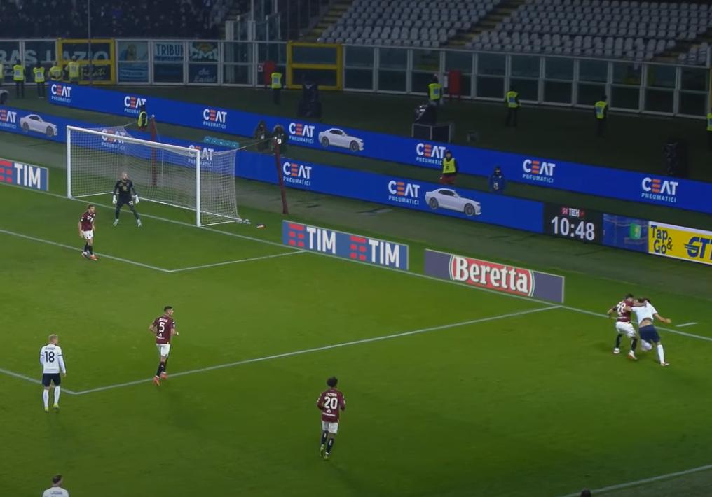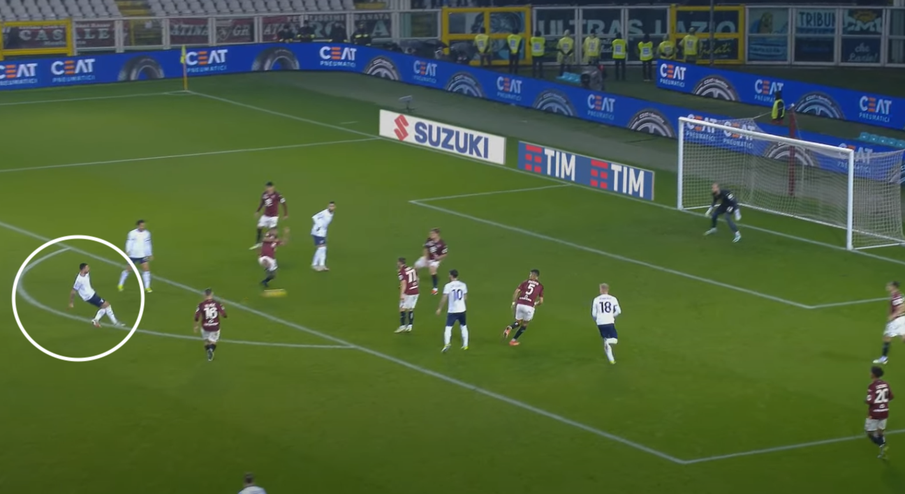 Lo spagnolo riceve spalle alla porta, il Toro è ben messo, salvo Vlasic. Il croato, che per tutta la partita ha dovuto seguire a uomo Cataldi, si dimentica del 32 biancoceleste (fuori dall'inquadratura e all'altezza della "X").