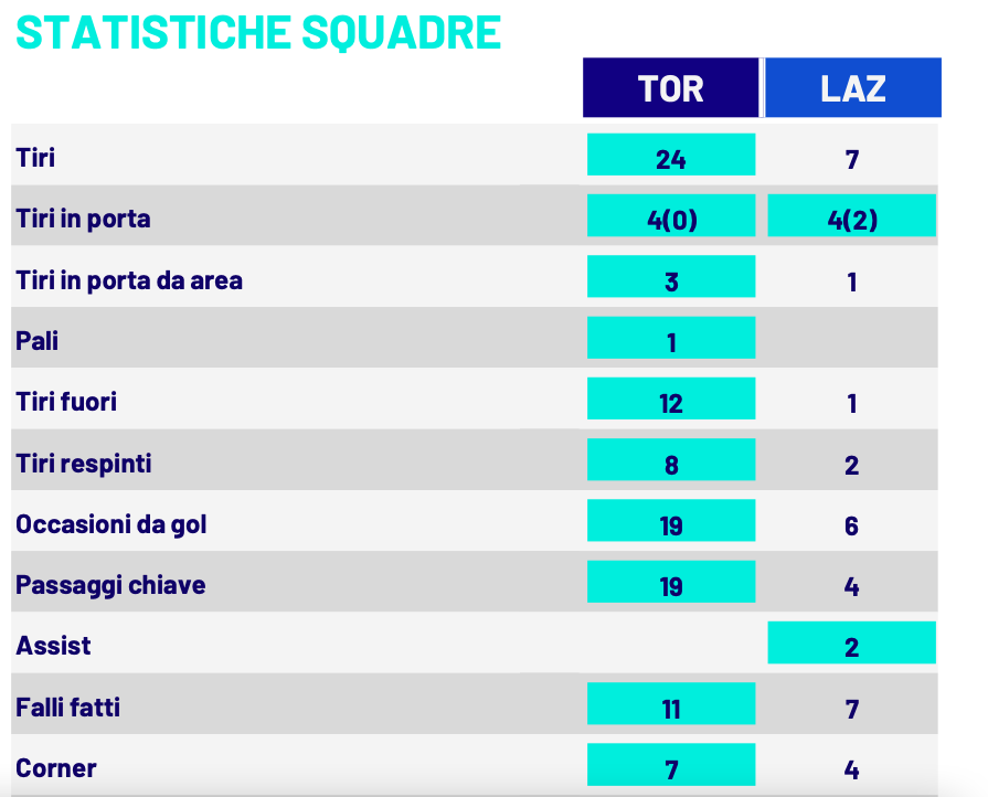 Il dominio granata è stato anche dal punto di vista del possesso palla: 60% per la formazione di Juric. Un Toro che ha dominato anche dal punto di vista territoriale, con il baricentro alto mediamente 51,06m nei primi 45' e 54,54m nella secondo tempo. Mentre la Lazio ha avuto un baricentro alto mediamente 50,05m nella prima frazione di gara e 49,47m nella ripresa. Il Torino si è rivelato una squadra a trazione anteriore, che ha affrontato gli ospiti a viso aperto, tentando la vittoria ma sono stati poco cinici e concerti. I biancocelesti così hanno punito i granata dimostrandosi superiori sia dal punto di vista realizzativi che mentale.