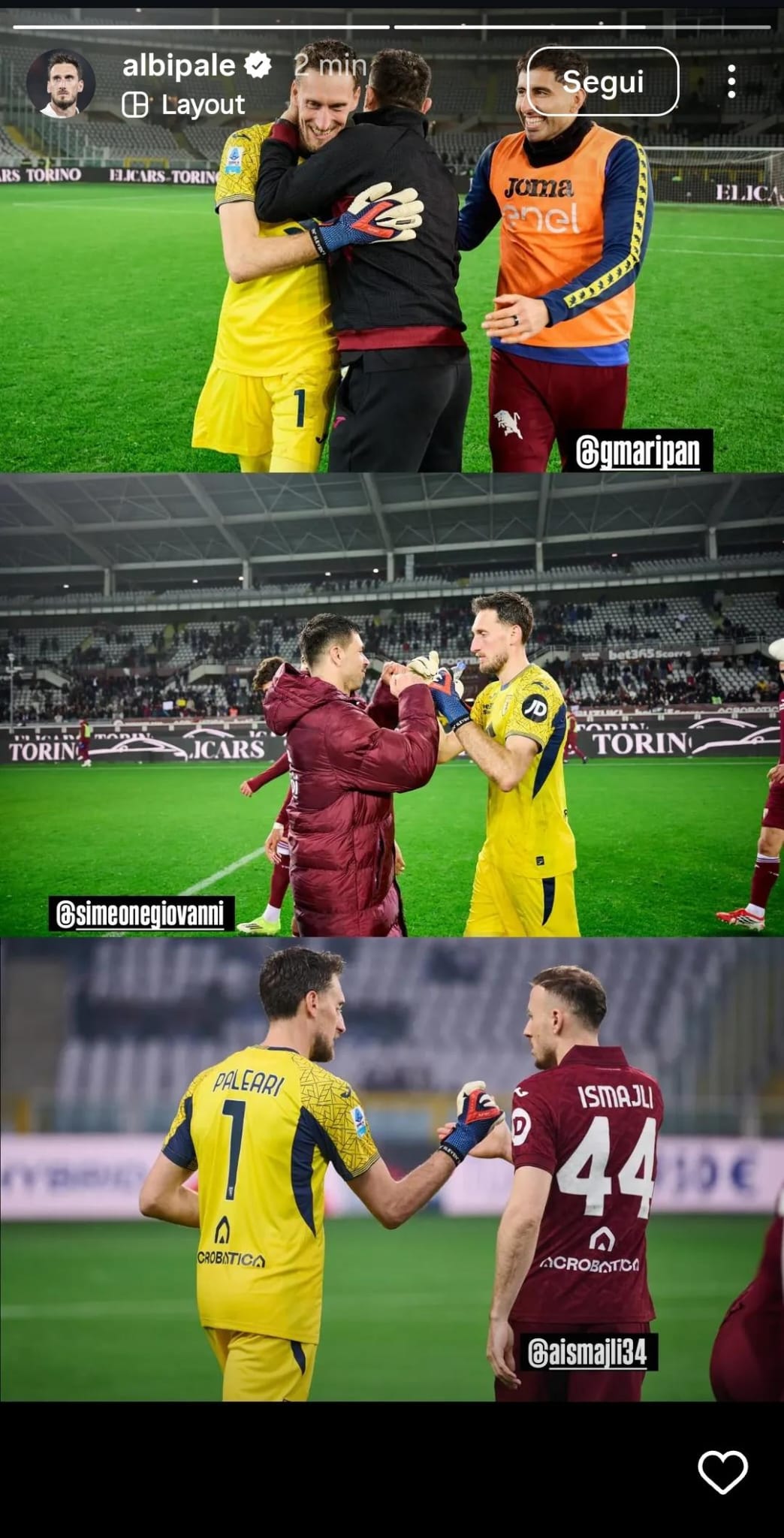 L'estremo difensore granata ha potuto esultare sia per la vittoria, sia per la porta inviolata, che è riuscito a mantenere sfoderando nei minuti finali un autentico miracolo sul colpo di testa ravvicinato di Romagnoli. Nelle sue storie, un trittico di foto che lo ritrae insieme a Maripan, Simeone e Ismajli.