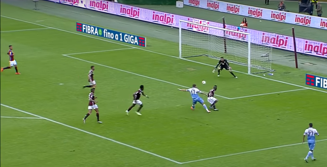 Il centrocampista è lucido e vede bene il gioco accorgendosi del movimento in profondità di Immobile e lo serve sulla corsa. Ciro è preso in consegna in area da Nkoulou, che sembra in controllo della situazione.