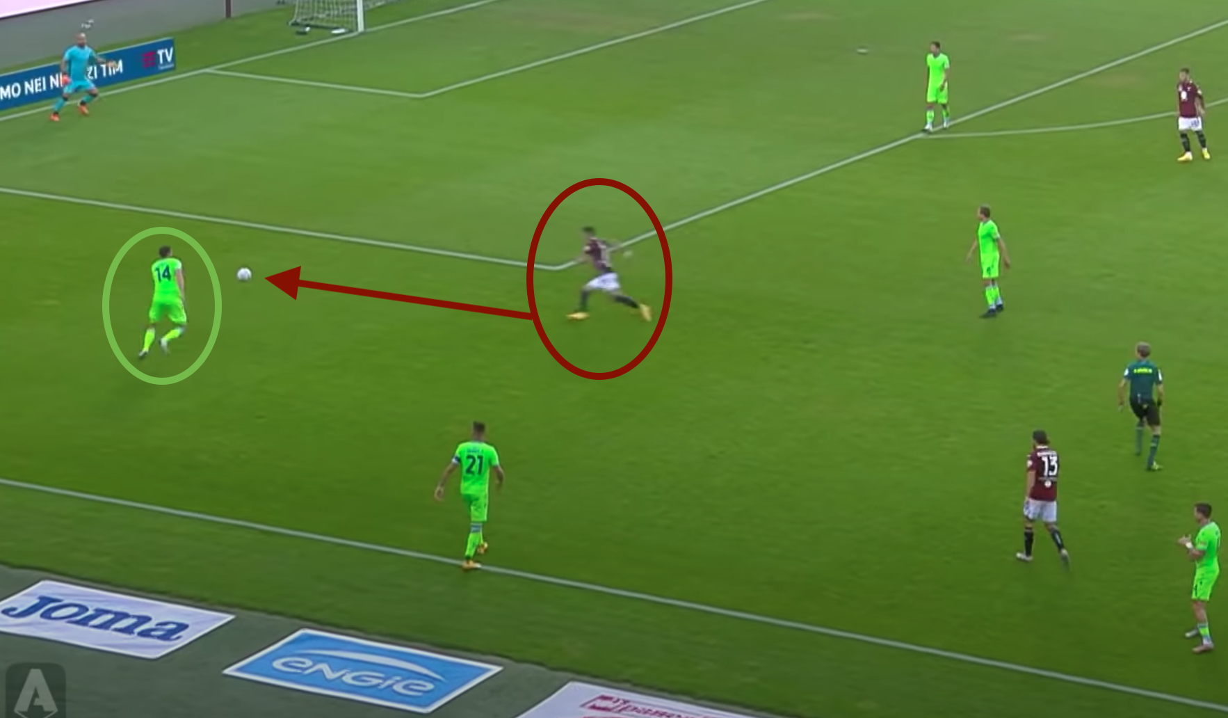 Il pressing di Lukic va a buon fine e scippa la palla a Hoedt. Così può andare a puntare la porta. Intanto Reina decide di uscire dai pali per cercare di anticipare il trequartista granata.