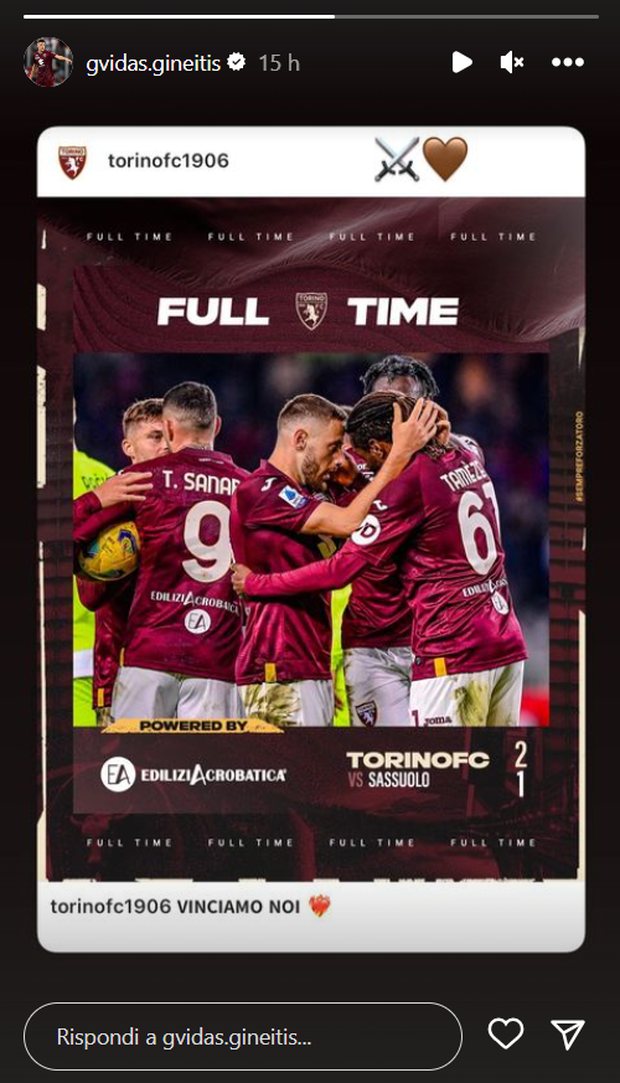 Anche Gvidas Gineitis ha assistito dalla panchina alla vittoria sul Sassuolo. L'ex Primavera, dopo due prove da titolare, è rimasto a riposto per la sfida con il Sassuolo. Il lituano ha comunque voluto dedicare sui social una storia al successo granata. Come Schuurs, Gineitis ha condiviso l'esultanza dopo il 2-1 corredandola da una coppia di emoji, le spade per la battaglia vinta in campo e un cuore.