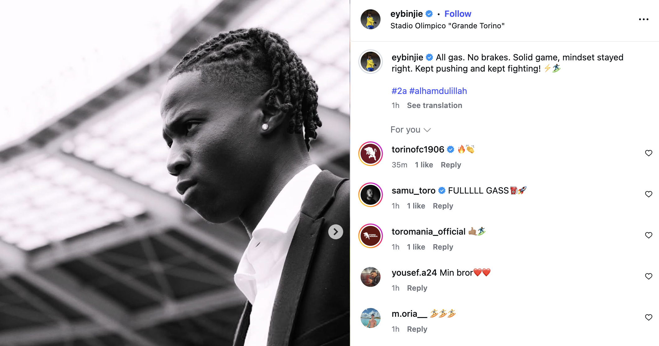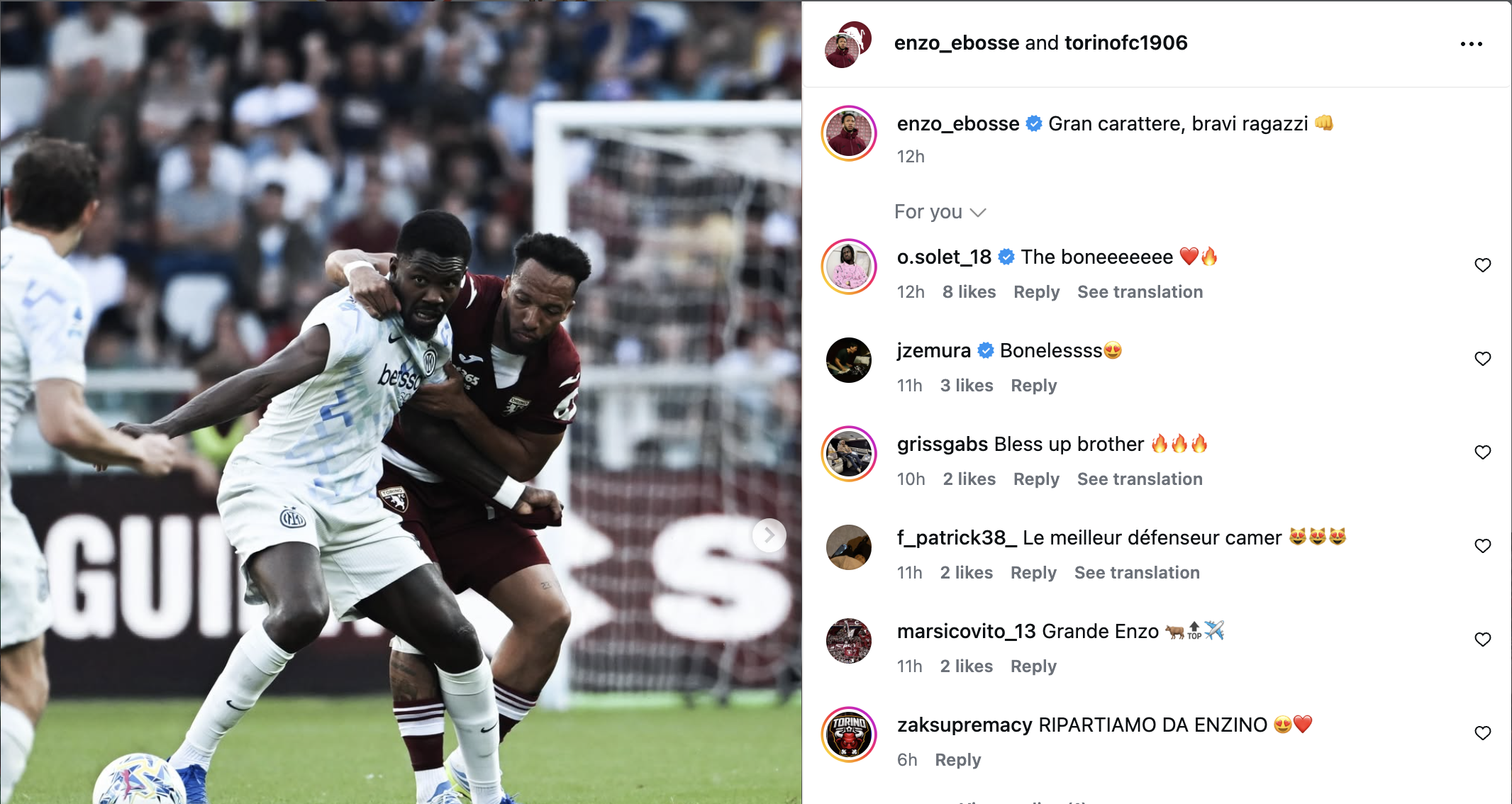 Contro l'Inter, Ebosse ha trovato dei clienti difficili, tra tutti Thuram che in Serie A ha raggiunto il suo dodicesimo gol stagionale trascinando la squadra. "Gran carattere, bravi ragazzi" scrive il difensore su Instagram: il Toro non ha mai mollato, si è rimesso in carreggiata e ha ripreso l'incontro.