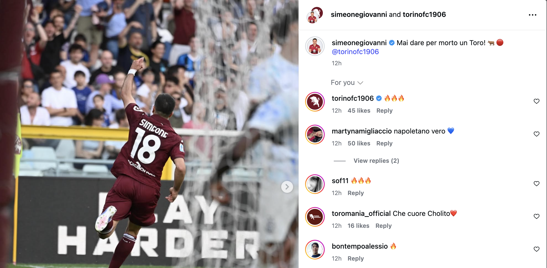 Ieri Simeone ha trovato la doppia cifra in termini di gol, e sui social ha festeggiato non tanto il risultato personale quanto quello di squadra: "Mai dare per morto un Toro" scrive l'argentino. Dopo la rete, Simeone ha chiamato in adunata la propria squadra e il proprio pubblico presente allo stadio. La reazione c'è stata.
