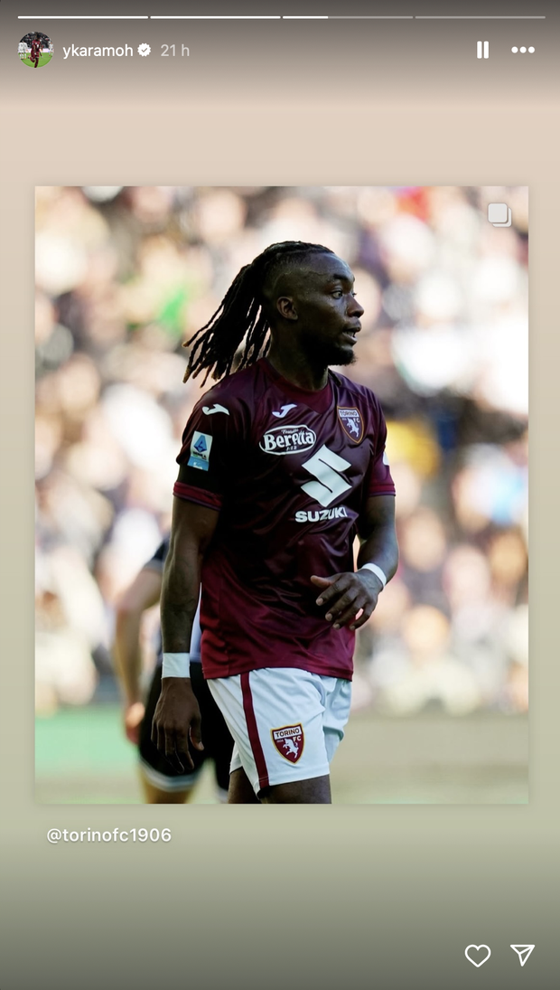 Ha ripubblicato sulle storie Instagram i vari post del Torino anche Yann Karamoh. L'attaccante ha cominciato ancora dal primo minuto la gara e sta guadagnando sempre di più la fiducia di mister Vanoli.
