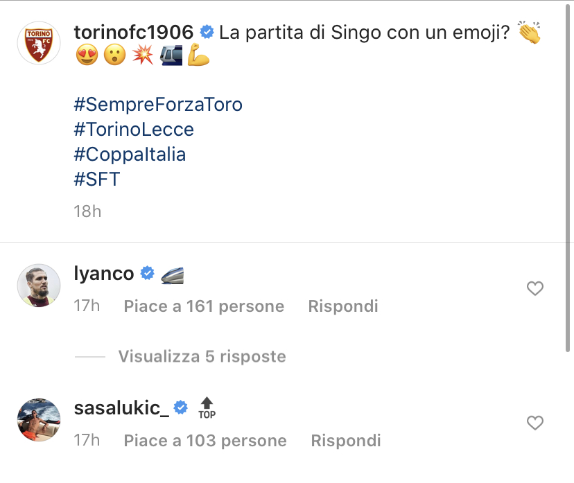 Simpatico siparietto nei commenti ad un post del Torino su Instagram, che chiede ai tifosi di descrivere la prova di Wilfried Singo con un emoji. Ci pensano Lyanco e Lukic: "Top" scrive il serbo, mentre il difensore brasiliano posta l'emoticon di un treno. Il riconoscimento di una grande prestazione arriva anche dai compagni di squadra.