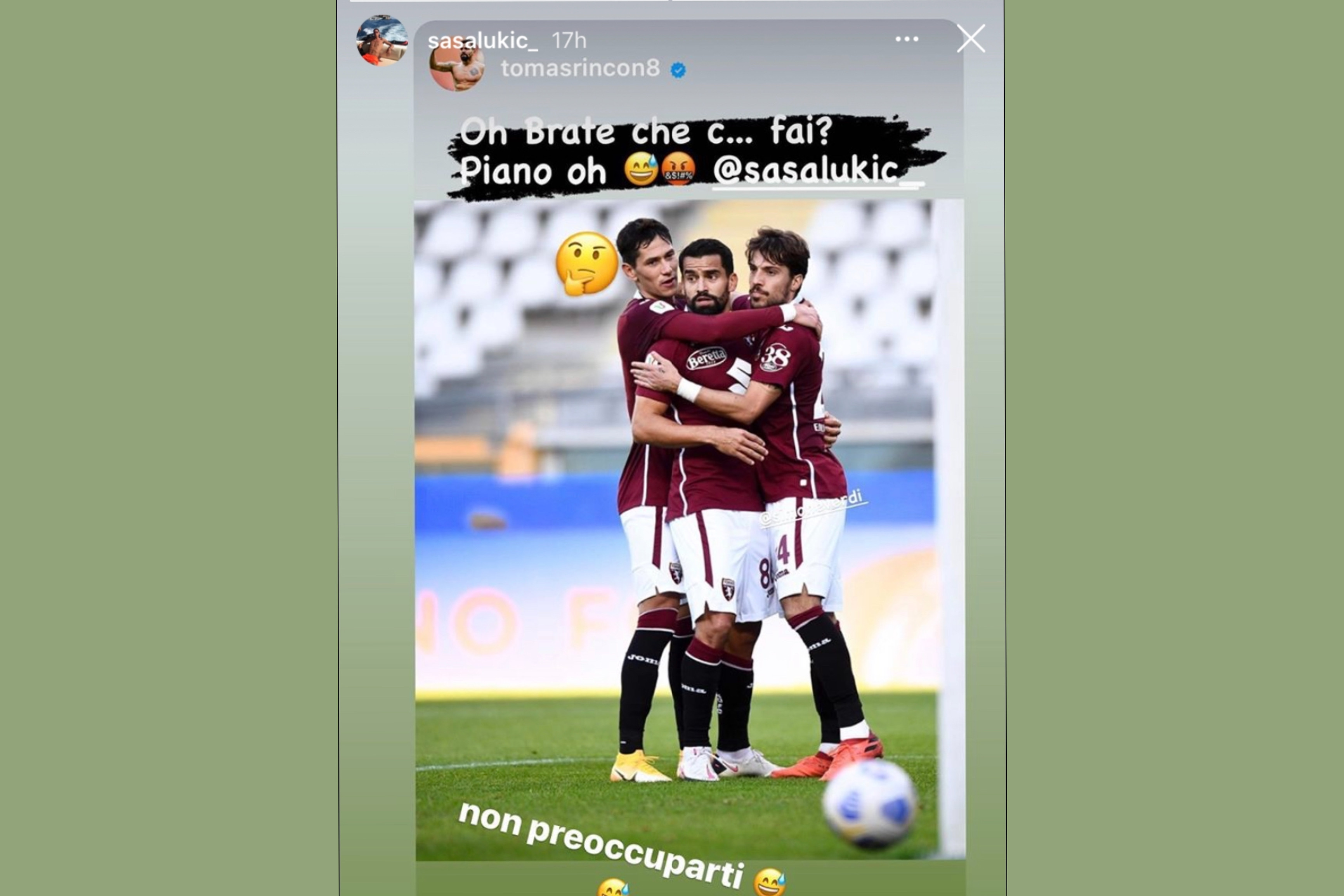 Fa sorridere anche il siparietto tra Sasa Lukic e Tomas Rincon nelle stories di Instagram. Botta e risposta tra il General e il numero 7 granata: il venezuelano pubblica la foto dell'esultanza dopo il goal di Verdi in cui c'è un energico abbraccio di Lukic scrivendo: "Oh brate, che c.... fai? Piano oh" e Lukic risponde "Non preoccuparti".