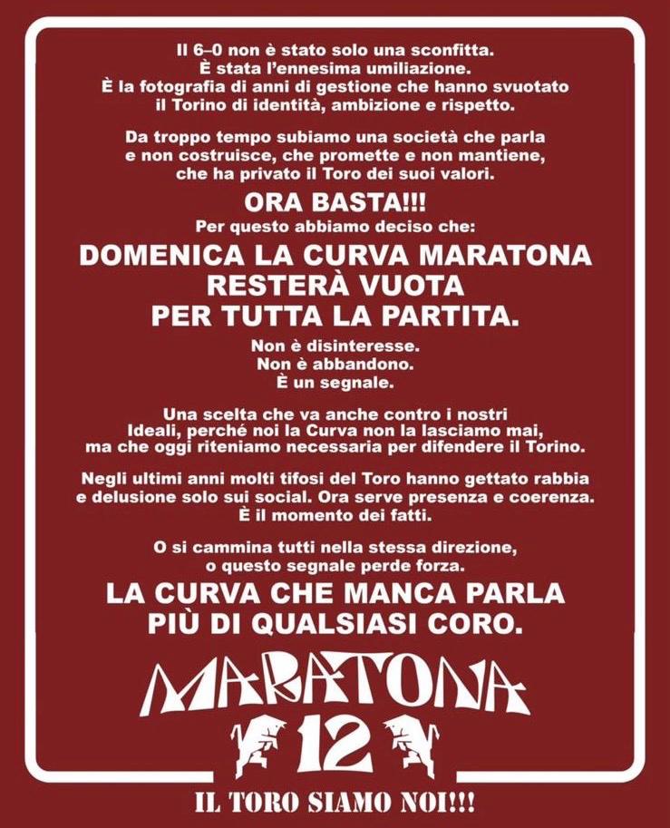 Dopo l'umiliazione subita al Sinigaglia, i tifosi granata sono in protesta. Tra il tifo granata serpeggia il malcontento e dopo la rovinosa sconfitta subita contro la squadra di Fabregas i supporters granata hanno deciso di prendere una decisione dura nei confronti della squadra e della società. Con un comunicato, il tifo organizzato granata ha deciso che in vista della sfida casalinga contro il Lecce, con fischio d'inizio alle ore 12:30 allo stadio Olimpico Grande Torino, la Curva Maratona resterà vuota per tutta la durata della partita. Nel comunicato si legge: "Una scelta che va anche contro i nostri ideali, perché noi la Curva non la lasciamo mai, ma anche oggi riteniamo necessaria per il difendere il Torino. Negli ultimi anni - continua - molti tifosi del Toro hanno gettato rabbia e delusione solo sui social. Ora serve presenza e coerenza. E' il momento dei fatti".