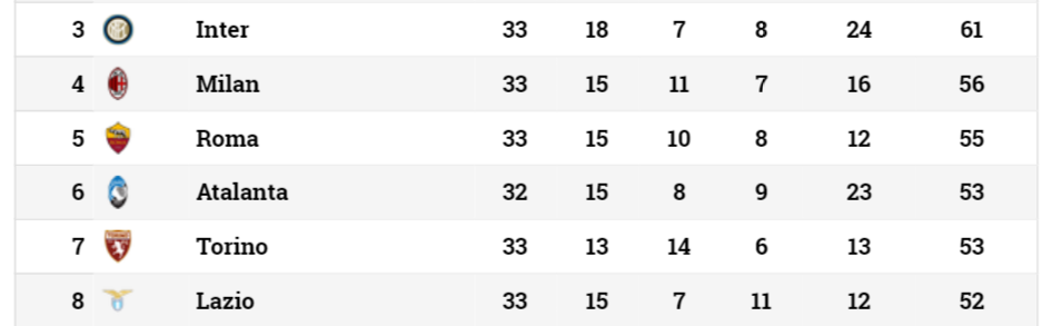 Con la vittoria di ieri per 1-0 contro il Genoa, il Torino si è portato al sesto posto, che quest'anno dista solo 3 punti dal quarto. Corsa per Champions League ed Europa League tutt'altro che chiusa, ed i risultati di Toro ed avversarie fanno ben sperare i granata.