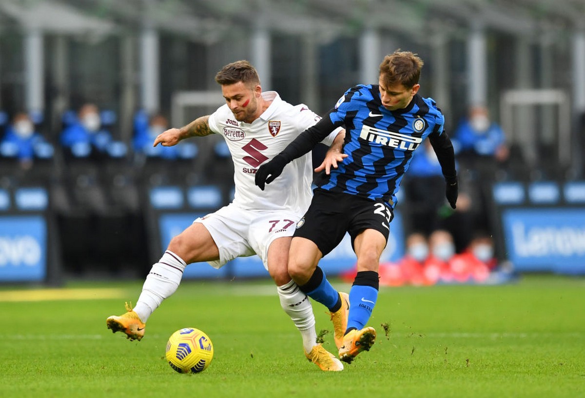 MILAN, ITALY - NOVEMBER 22: Karol Linetty of Torino battles for possession with Nicolo Barella of Inter Milan during the Serie A match between FC Internazionale and Torino FC at Stadio Giuseppe Meazza on November 22, 2020 in Milan, Italy. Sporting stadiums around Italy remain under strict restrictions due to the Coronavirus Pandemic as Government social distancing laws prohibit fans inside venues resulting in games being played behind closed doors. (Photo by Valerio Pennicino/Getty Images)