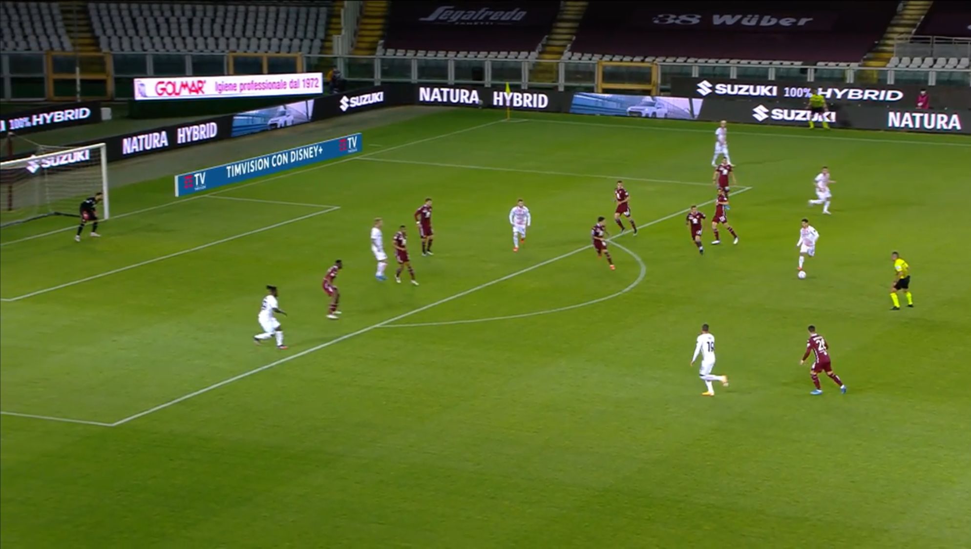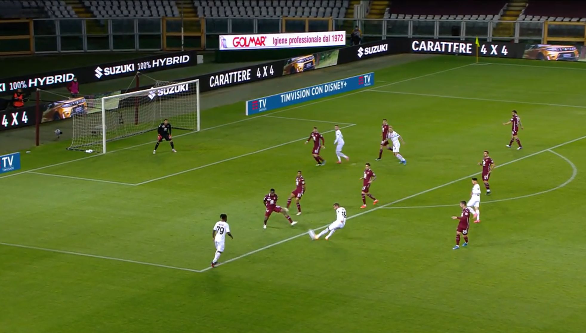 Troppo lenta in questo caso la lettura dei due giocatori del Torino - Singo e Bremer - che escono in ritardo sull'avversario concedendogli il tiro. Il resto lo fa Theo Hernandez, che batte Sirigu con un sinistro imparabile che termina a fil di palo alla sinistra del portiere granata.