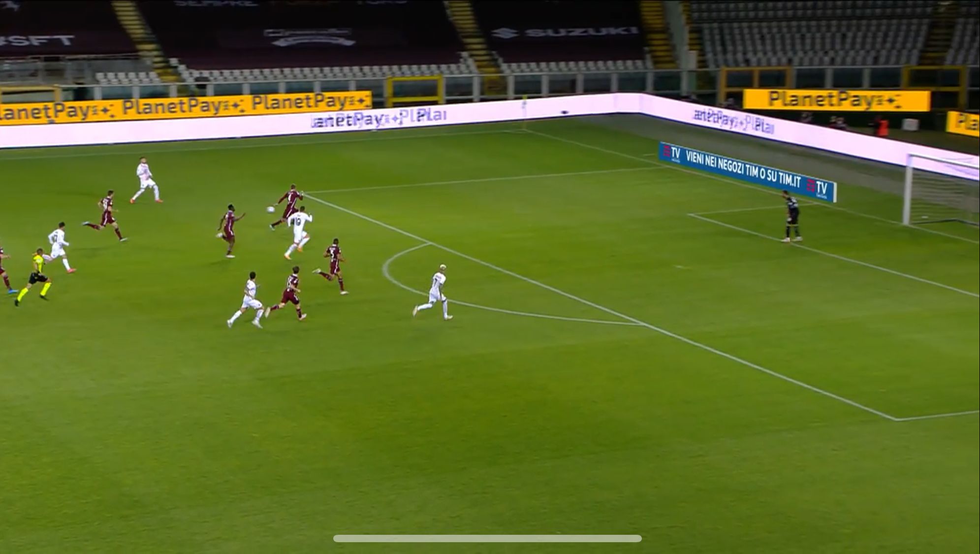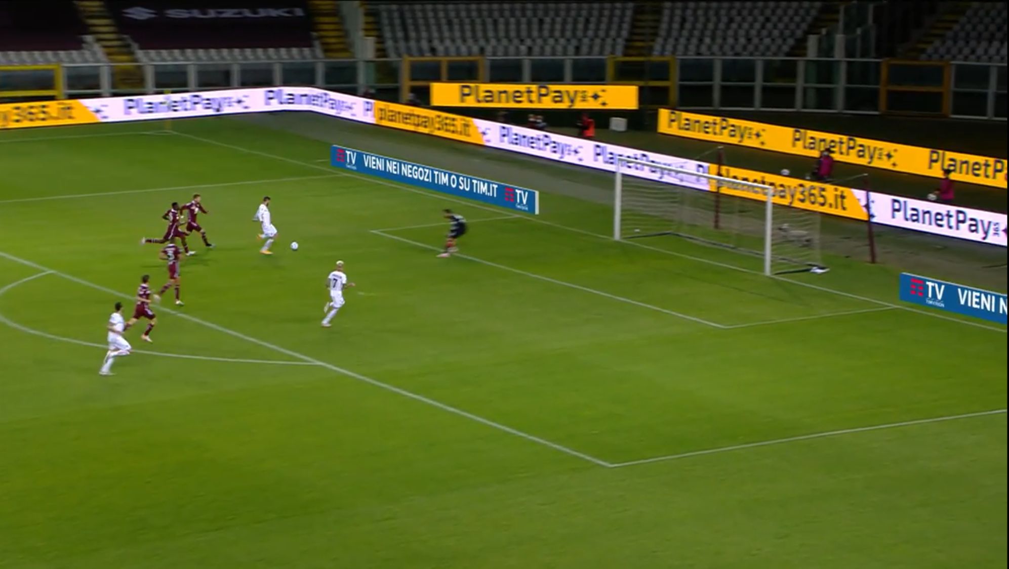 Movimento da attaccante puro quello del terzino rossonero, che supera Sirigu con un tocco sotto nonostante al centro ci fosse liberissimo Castillejo. Un'immagine che spiega molto bene come dopo l'ora di gioco la squadra di Nicola si fosse ormai completamente disunita.