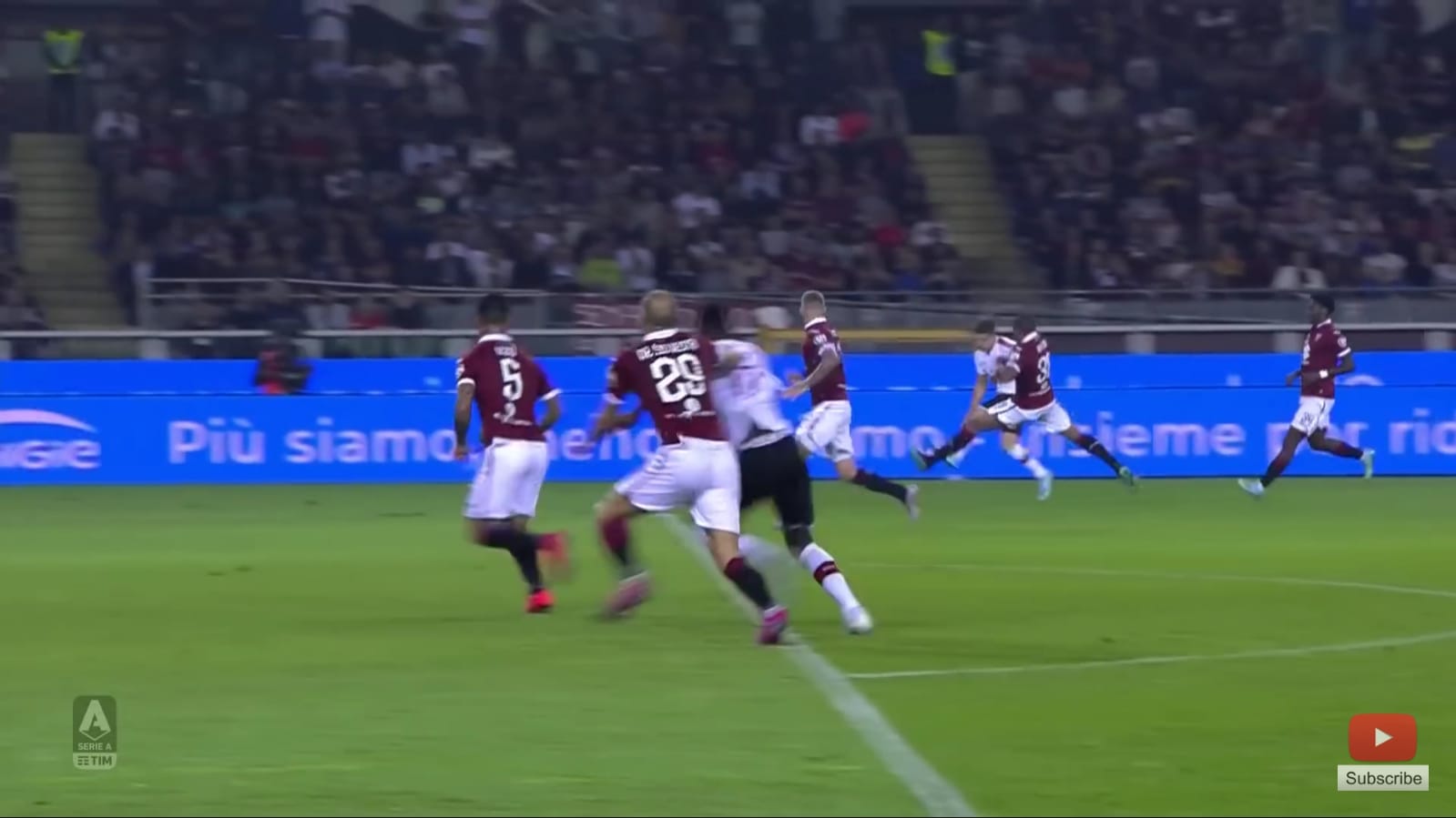 Il Gallo, a cui anche qui il Milan lascia troppo spazio, punta Bennacer e galoppa verso la porta mentre la difesa avversaria arretra per contrastarlo.
