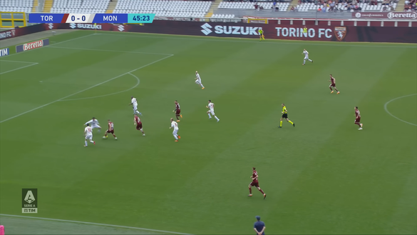 Vlasic stoppa la palla, alza la testa e serve subito Sanabria che nel frattempo dopo il contrasto sta correndo verso la porta (immagine 3). Il numero 9 paraguaiano è poi bravo con una finta di corpo a mandare a vuoto Caldirola che voleva frapporsi tra lui e la porta.