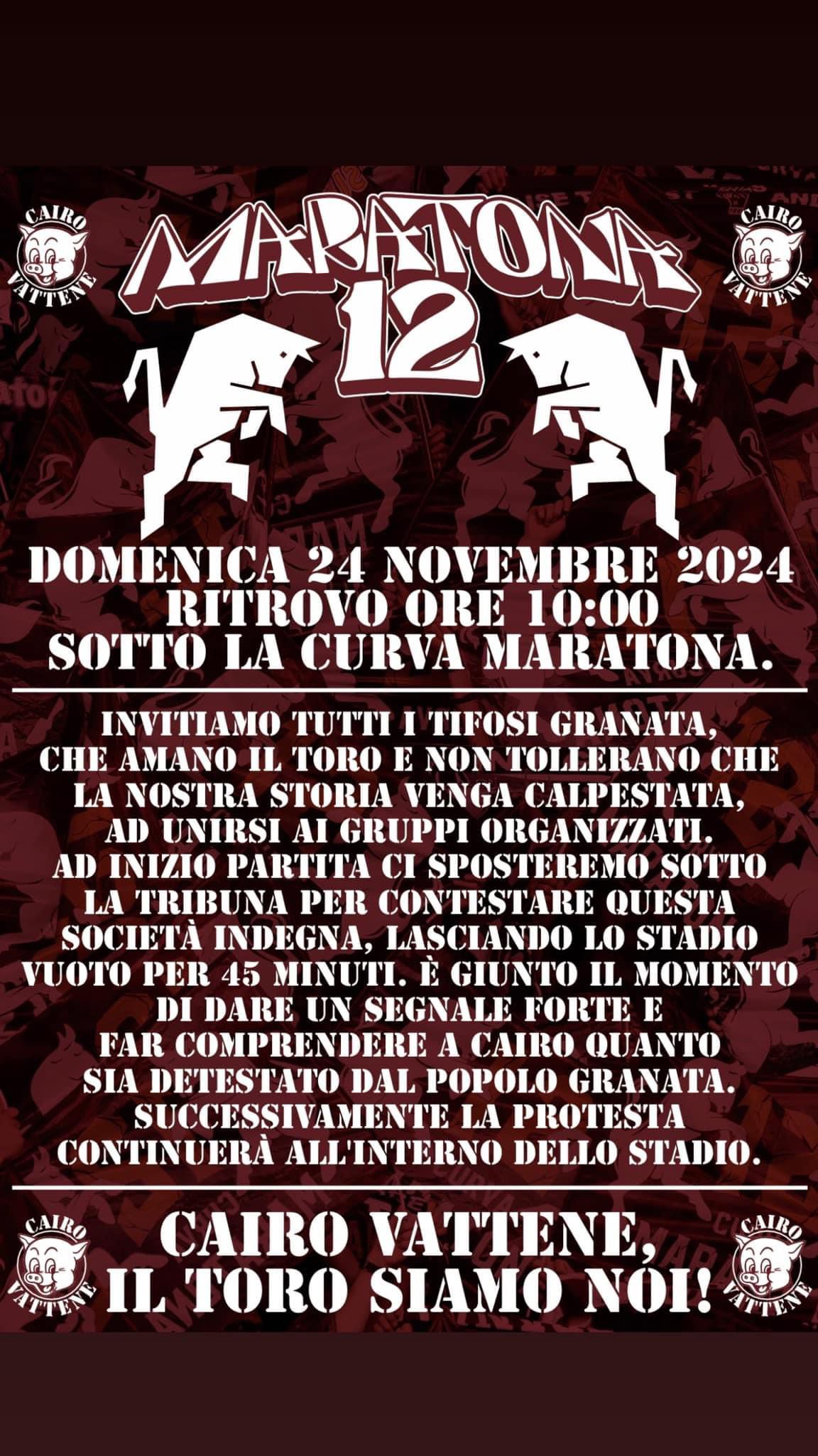 I gruppi organizzati della curva Maratona annunciano una contestazione diretta alla società del Torino in occasione di Torino-Monza. Come da comunicato, il ritrovo sarà alle ore 10 sotto la curva Maratona, dove inizierà la protesta cercando di concentrare il numero più elevato possibile di tifosi. Successivamente, ad inizio partita, i tifosi si sposteranno sotto la tribuna continuando a contestare, e disertando quindi lo stadio per i primi 45 minuti del match. Infine, i gruppi organizzati (e chiunque aderirà alla protesta) entreranno allo stadio, dove continuerà la contestazione. L'obiettivo proclamato è quello di "far comprendere a Cairo quanto sia detestato dal popolo granata".