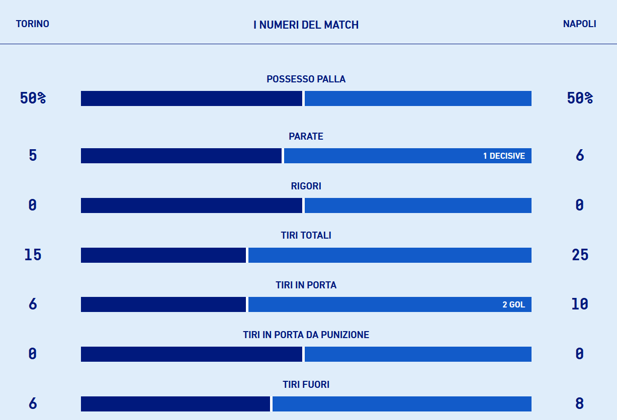 QUALITA' - Nonostante Torino e Napoli si siano spartite equamente il possesso del pallone (50% a testa) appare chiaro che Insigne e compagni abbiano saputo gestirlo in maniera migliore. Il risultato, maturato nel primo quarto d'ora di gioco grazie alle reti di Bakayoko e Osimehn, entrambe da fuori area - grazie alle quali il Napoli è diventato il quarto club capace di realizzare almeno 20 reti da fuori area in una singola Serie A dal 2004/05, dopo Juventus, Milan e Atalanta - avrebbe dunque potuto essere più largo, e solamente la buona prestazione di Sirigu, insieme a due pali, ha impedito agli azzurri di dilagare.