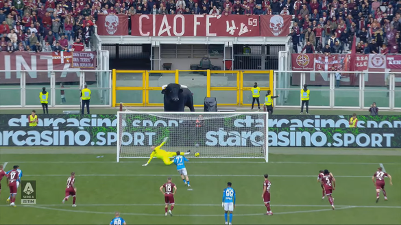 Sul dischetto si presenta lo stesso attaccante georgiano che ha conquistato il fallo. Il tiro del 77 azzurro è centrale ma tanto basta per battere Vanja che si era tuffato alla sua destra e anche con il piede non riesce ad evitare il gol (immagine 2). Al minuto 35 il Napoli si trova così già in vantaggio di due reti.